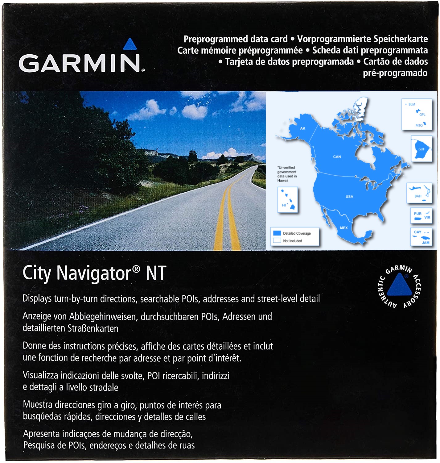 This Garmin City Navigator NT North America version provides detailed road maps and points of interest for your Garmin compatible device, so you can navigate with precise and detailed directions to any address or intersection. In addition to maps of the United States, Canada, and Mexico, City Navigator NT North America also includes maps of Puerto Rico, Virgin Islands, Cayman Islands, Bahamas, French Guyana, Guadeloupe, Martinique, and Saint-Barthélemy.
