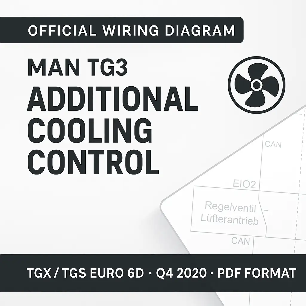This official wiring schematic details the Additional Cooling Control system for MAN TG3 series trucks (TGX and TGS) equipped with Euro 6d engines. It includes a comprehensive view of the fan drive control (Regelventil Lüfterantrieb), EIO2 module, and CAN I-CAN data bus structure.